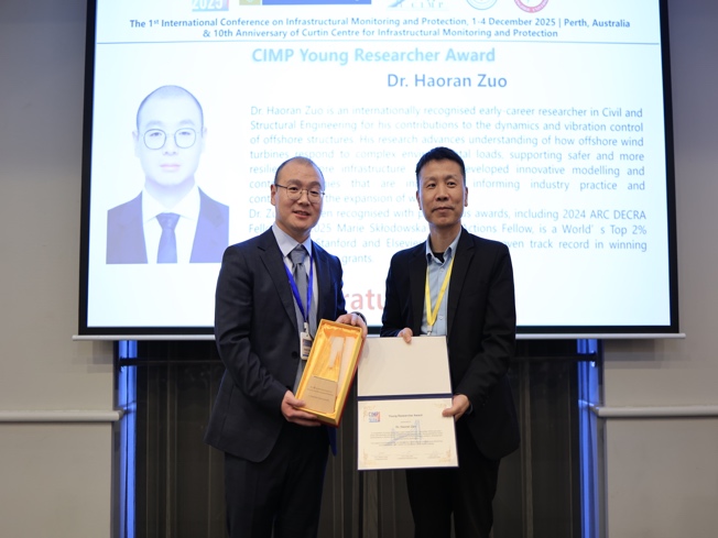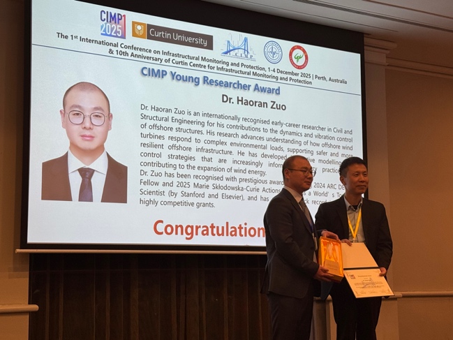 近日,2025年基础设施监测与防护国际会议(The 1st International Conference on Infrastructural Monitoring and Protection, CIMP1-2025)在澳大利亚珀斯成功召开。凭借在“海上风电结构动力学分析与结构振动控制”领域的创新性研究成果与突出的国际学术影响力,左浩然副教授荣获大会颁发的“CIMP青年研究者奖”(CIMP Young Researcher Award)。澳大利亚新南威尔士大学教授、《Engineering Structures》期刊副主编Wei Gao为左浩然副教授颁奖。